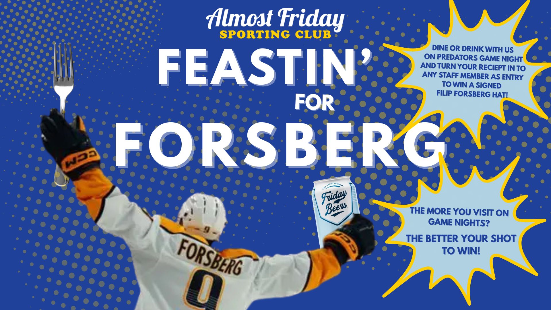 Game day just got even better! Whether you’re here to pregame, postgame, or post up and watch every play, make sure you save your receipt! Turn it in at the bar and you’ll be automatically entered to win exclusive, autographed Filip Forsberg merch — yes, the real deal. Come for the vibes, stay for the action… and you just might leave with a piece of Preds history!